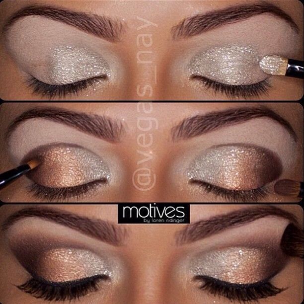 Silver and bronze eye shadows are quite stylish when applied this way. A thin eye liner and curly lashes will complete this eye makeup in an effortless way.