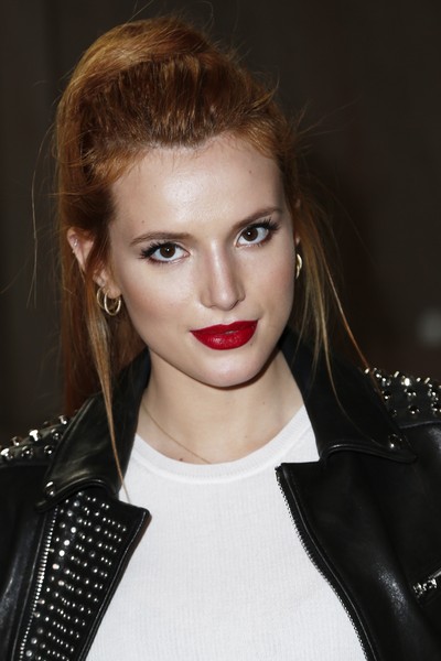 The retro high ponytail looks quite fashionable with the brown hair color and a red lipstick makeup look.