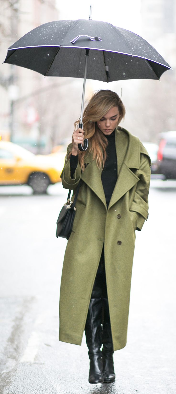 Unlike the black coats and grey ones, this olive green coat looks more cheerful and it’s faddish for all women to try.