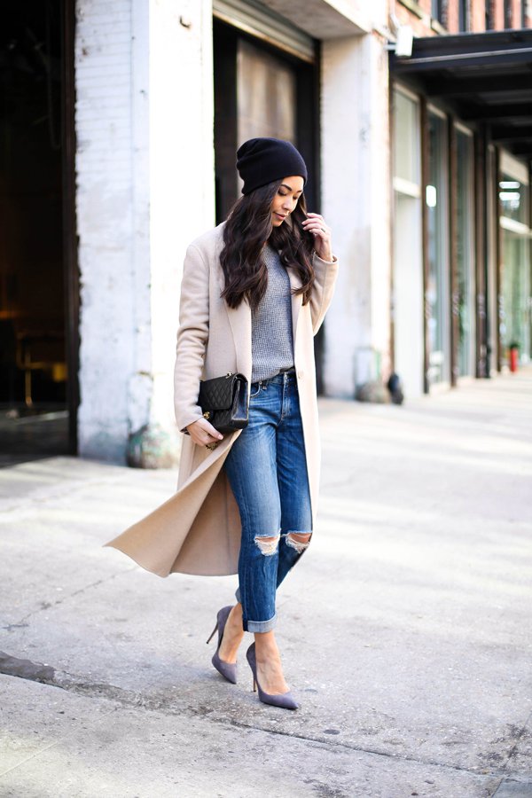 Colored long coat seems to be more fashionable and suitable for young fashionistas. Plus, the ankle-length jeans will make your legs look slimmer and longer.