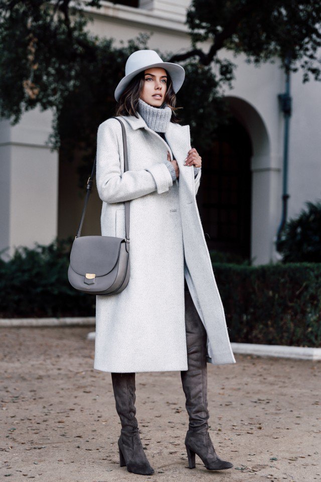 The classic black, white and grey can look so chic when what you wear is a grey long coat, a white sweater and a black hat.