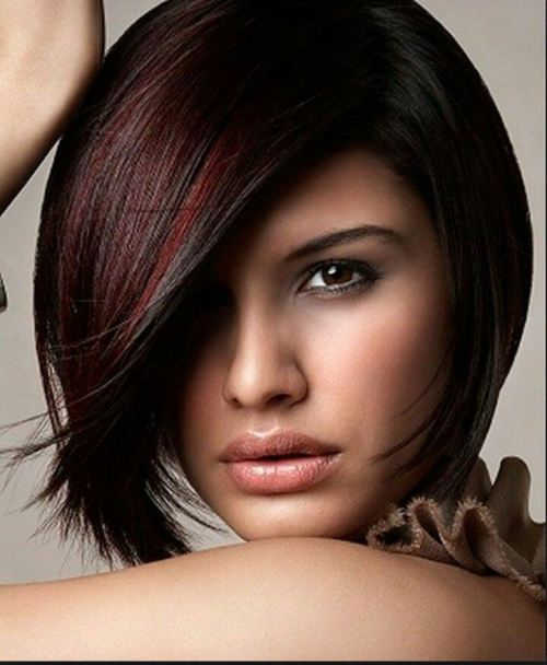 If you want to make your face look smaller, just have a try with this side-parted sleek bob haircut. Plus, the burgundy highlights can make your hair look more lustrous.