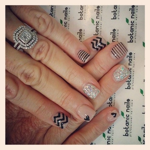 Glitters, stripes, hearts and waves. Your short nails will look rather chic and fun with the stylish designs on each nail.