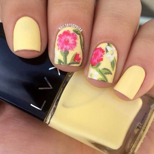 The pastel yellow nails are very pretty and soft. In additon, those blooming flowers make this nail design more engaging. If you like pastel nails, just try it.