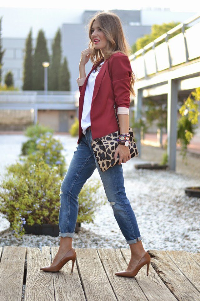 Burgundy Blazer with Jeans via www.miaventuraconlamoda.com