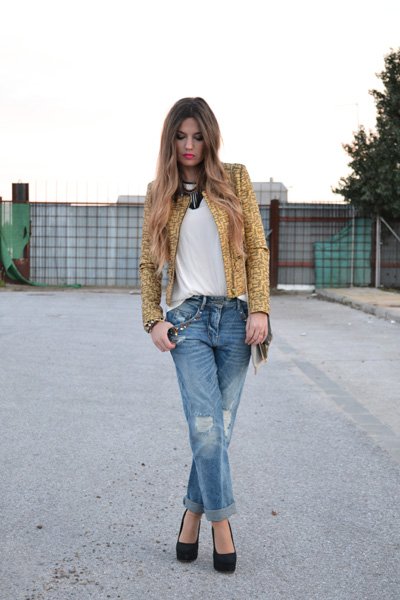 The white blouse is the best friend to the jeans. They show the youthful attitude of the wearer. To make it more stylih, you may lay a chic jacket over the white blouse. In addition, the black high heel pumps really upgrade the whole look.