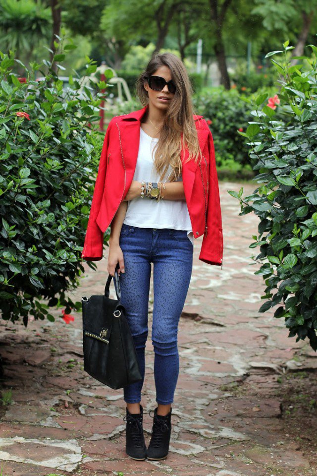 Pretty Spring Outfit Idea with Jackets and Red Jeans via www.miaventuraconlamoda.com