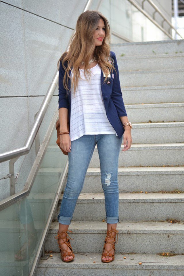 Any casual outfits will be more stylish when you add one more blazer and a pair of high-heel sandals. Wear some pretty accessories if necessary.