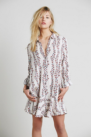 What makes this shirt dress so eye-catching is the vintage print. That and the fact that it looks like it’s made out of flowing material like rayon or perhaps polyester.
