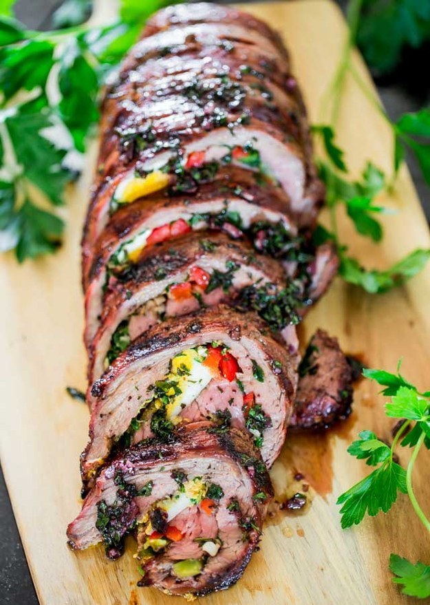 Stuff the flank steak with chimichurri sauce, peppers and eggs. Just imagine how tasty it will be! Follow the recipe and try it.