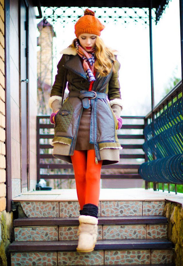 For an edgier look, just take it into consideration that to buy some colored leggings. But you should wear them in a simple way. For example, you can pair them with a hats or coats in the same color, or just pair them with the safe black, white, brown and any other neutral shades.