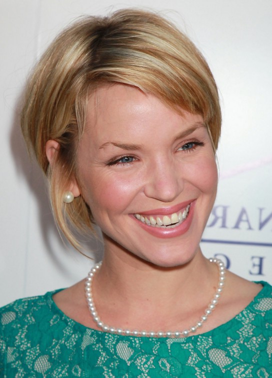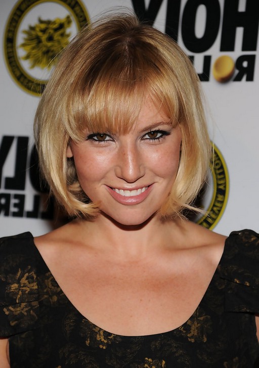 Jaime Pressly Short Bob Haircut with side Swept bangs for Round Face Shapes /Getty images