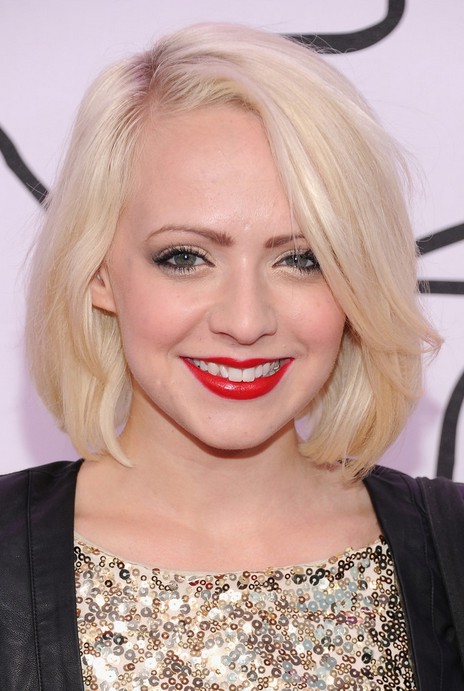 Madilyn Bailey Short Blonde Bob Hairstyle with Bangs /Getty images