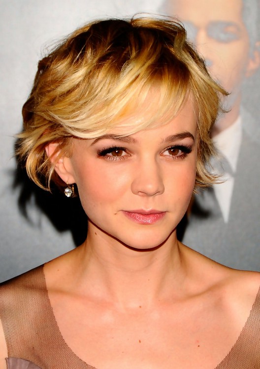 Carey Mulligan Hairstyles: Cute Short Haircut with Side Swept Bangs /Getty images