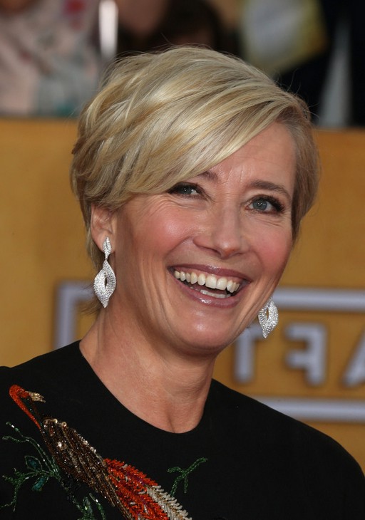 Emma Thompson Hairstyles: Layered Razor Cut with Bangs for Women Over 50 /Getty images