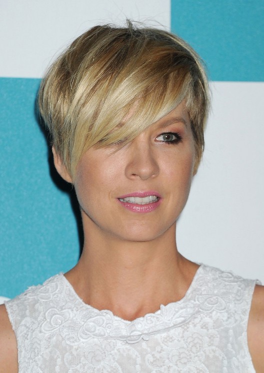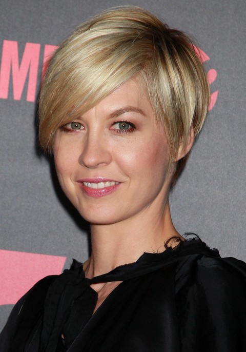 Jenna Elfman Haircuts: Layered Short Razor Cut with Side Swept Bangs /Getty images