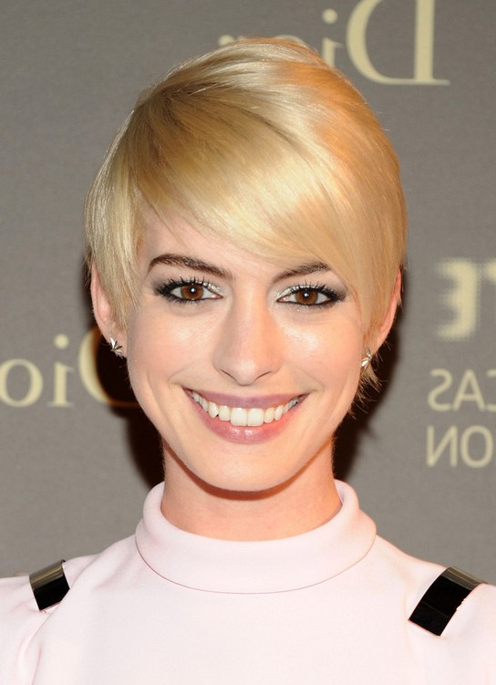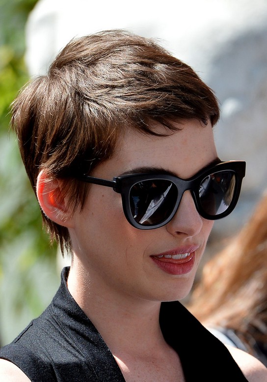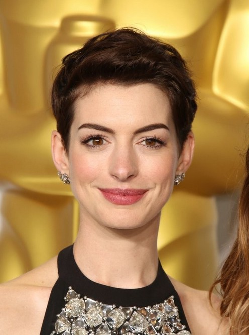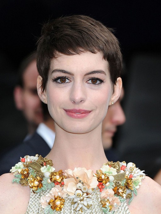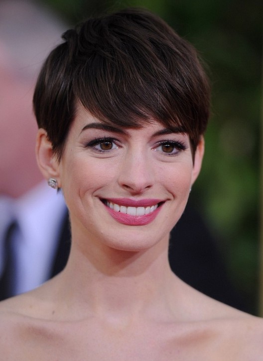 Anne Hathaway Short Straight Pixie Hairstyle with Side Swept Bangs /Getty images