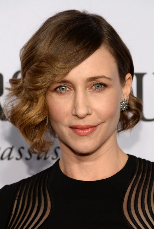 Vera Farmiga Side Parted Curly Hairstyle with Side Swept Long Bangs /Getty images