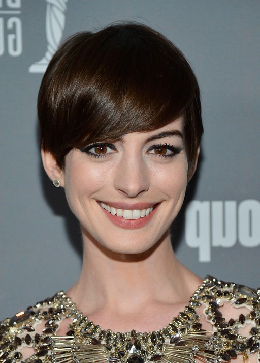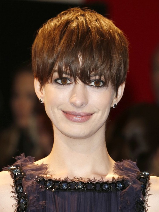 Anne Hathaway Haircut: Chic Short Straight Haircut with Side Swept Bangs /Getty images