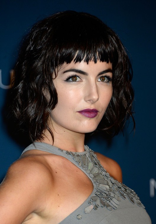 Camilla Belle Hairstyles: Short Black Wavy Hairstyle with Full Bangs /Getty images