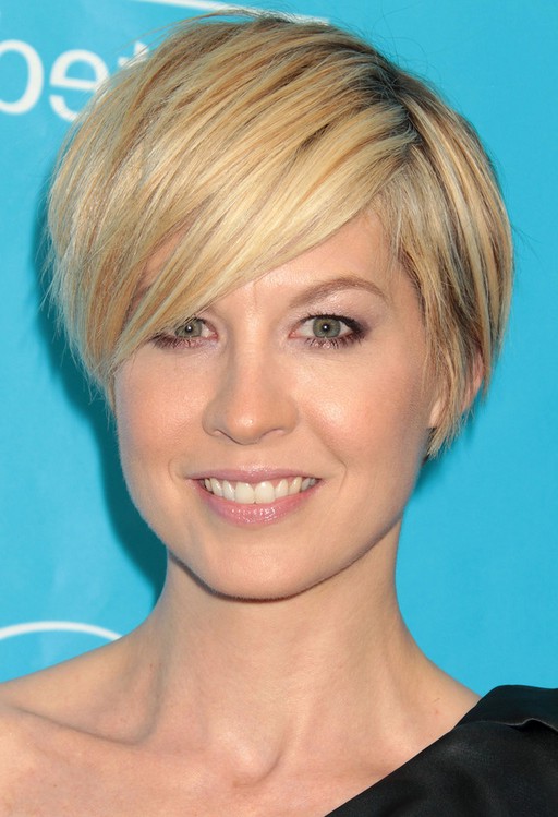 Jenna Elfman Hairstyles: Casual Short Haircut with Long Side Swept Bangs /Getty images
