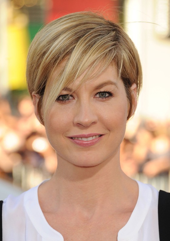 Jenna Elfman Hairstyles:Short Straight Haircut with Side Swept Bangs for Summer /Getty iamges