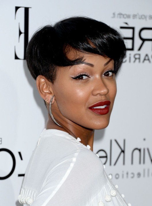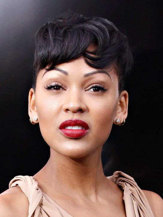 Meagan Good Hairstyles: Short Boyish Haircut with Messy Bangs /Getty images