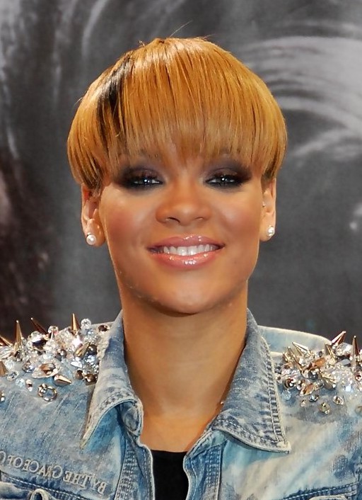 Rihanna Haircuts: Short Straight Bowl Cut with Straight Across Bangs /Getty images