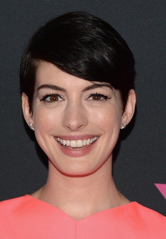Anne Hathaway Cute Short Side Parted Black Straight Cut
