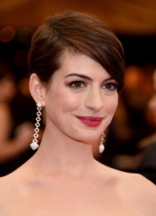 Anne Hathaway Side Parted Straight Hairstyle with Bangs /GEtty images