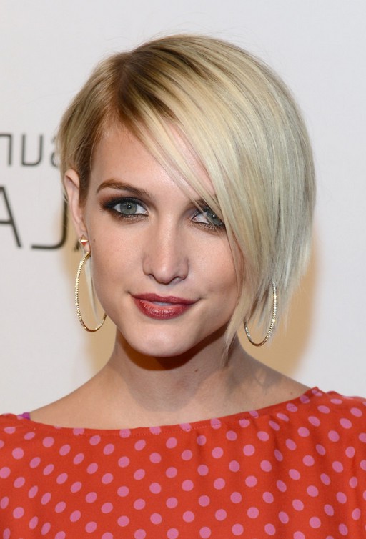 Ashlee Simpson Side Parted Short Straight Hairstyle with Long Bangs /Getty images