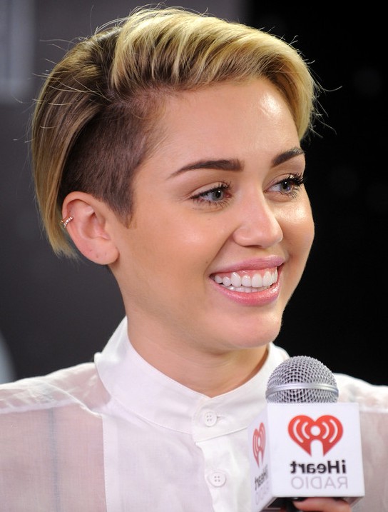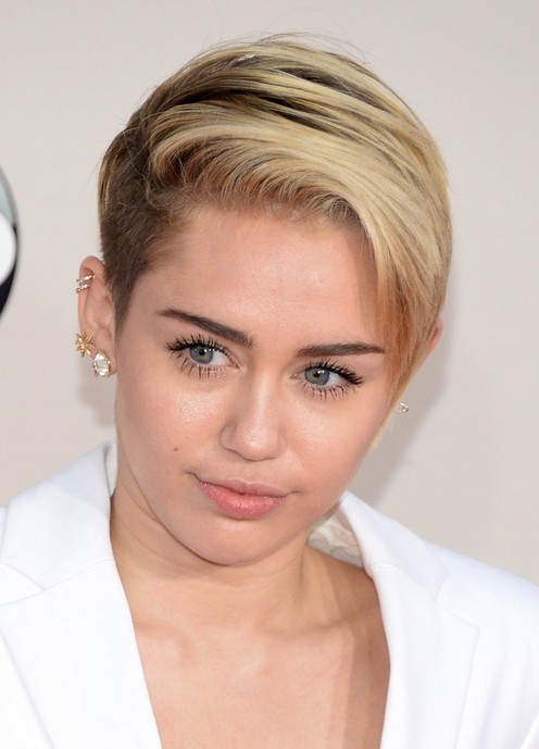 Miley Cyrus Hairstyles: Side Parted Short Blonde Straight Hairstyle for Girls /Getty images