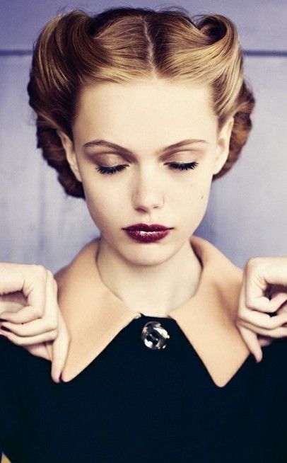 The vintage updo hairstyle looks more sophisticated with dark berry lipstick makeup. Besides, the long curly lashes will make your eyes talk and more charming.