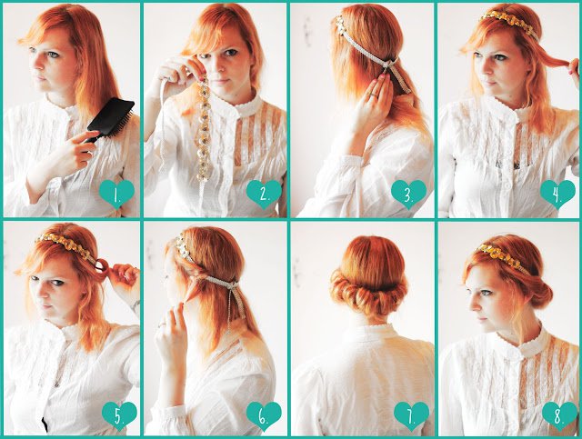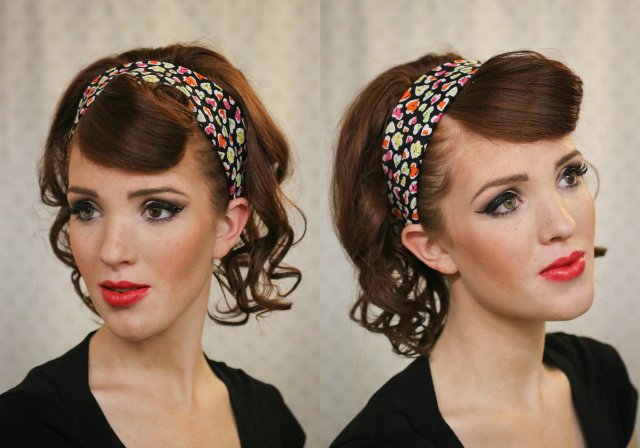This retro head band hairstyle is an ideal hair look for holidays and dates. All the hair is twisted and then pinned forward. The curly ends become cute bangs as the kerchief is used to encase the head. Younger girls who love this adorable and fashionable look can follow the steps and have a try.