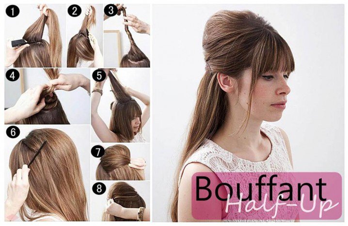 Here is another bouffant hairstyle. Unlike the previous one, this hair look is neater and sleeker. The thick blunt bangs add more lovley vibe to the retro look, which makes this bouffant updo hairstyle so fantastic for young women. So sweet! I like it and can’t wait to have a try. What about you?